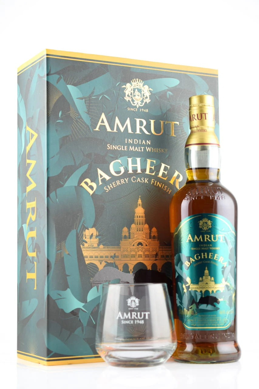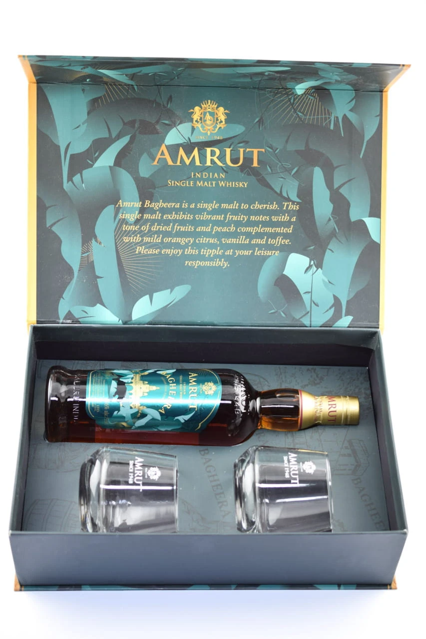 Produktbeschreibung „Amrut Bagheera 46%vol. 0,7l – mit zwei Gläsern“