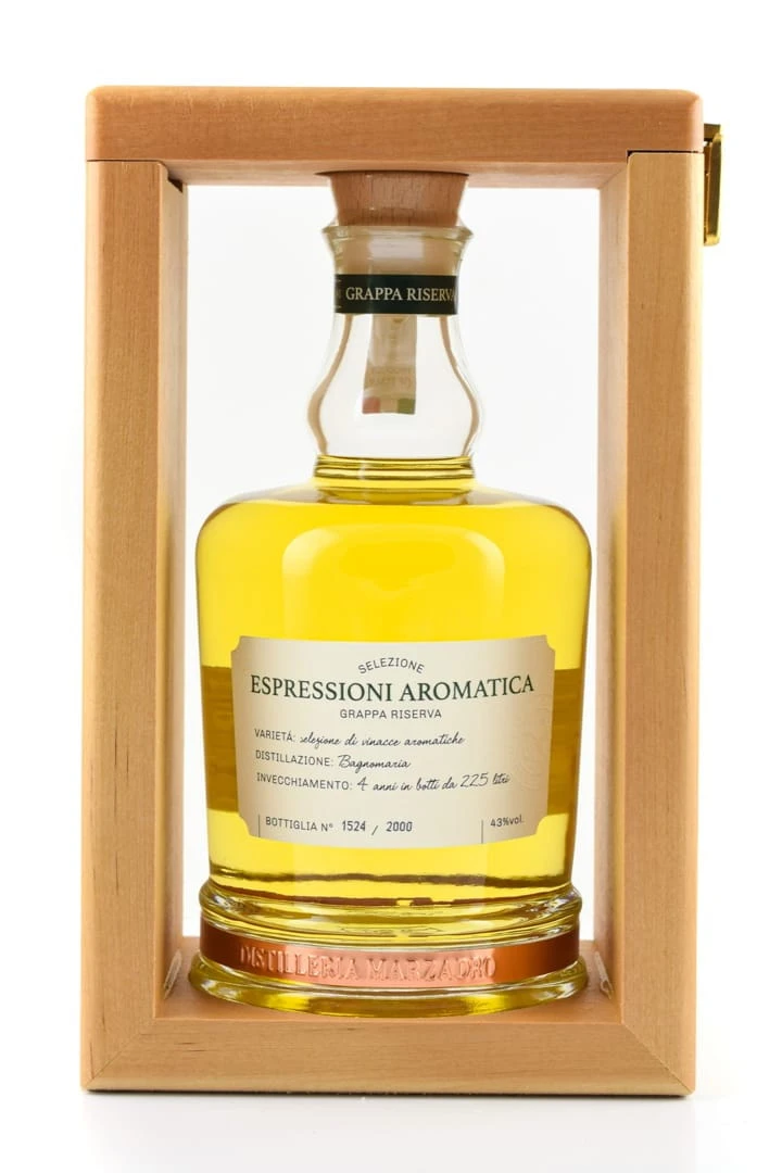 Der Espressioni Aromatica Grappa Riserva Marzadro stammt aus der Wasserbad-Destillation aromatischer Trester, die anschließend vor der Reifung mit Geschick gemischt werden.