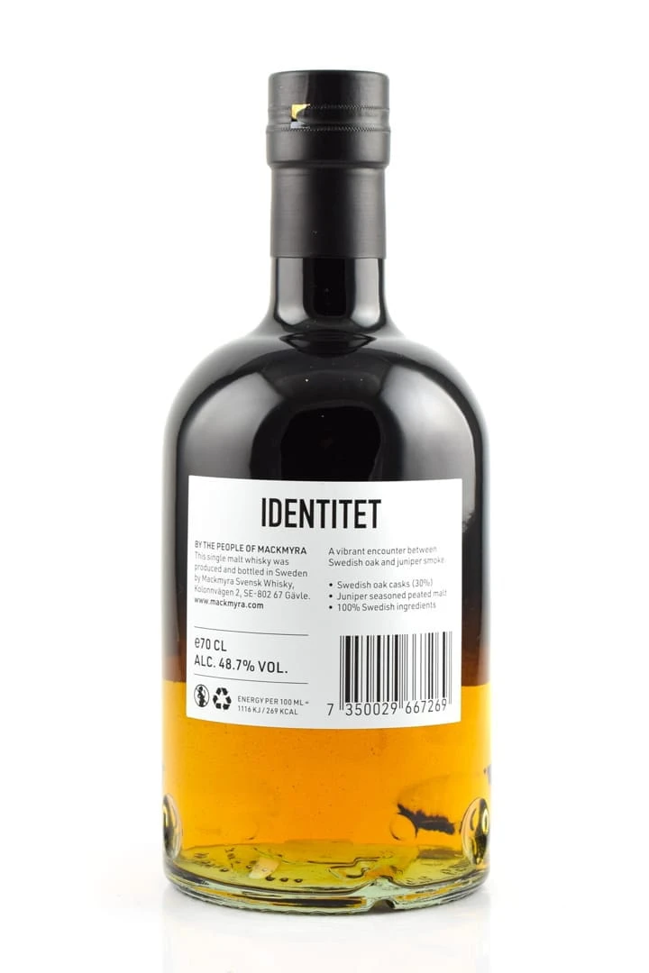 Erstmals kombiniert nun ein Single Malt Whisky diese beiden Hauptbestandteile der schwedischen Brennerei – und beschreibt deren Seele und Charakter: Mackmyra Identitet ist eine lebhafte Begegnung zweier großer Persönlichkeiten. Ein rauchiger Whisky, bei dem das von Lagerfeuerrauch, Zitrus, Vanille, braunem Zucker und Ingwer geprägte Geschmackserlebnis immer intensiver wird und schließlich in einem langen Abgang seinen Höhepunkt erreicht.