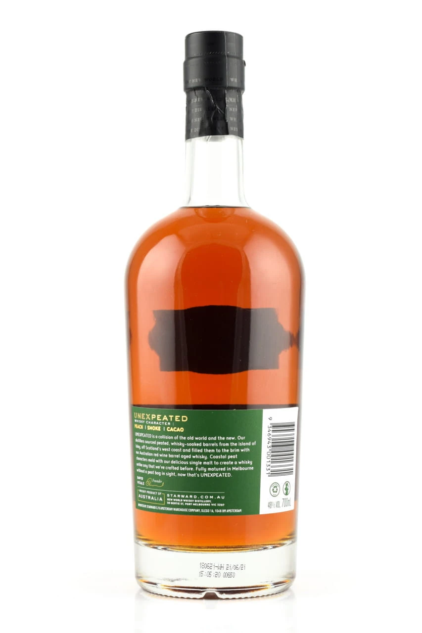 Für Unexpeated veredeln die Australier ihren herrlich fruchtigen, ausschließlich in Rotweinfässern gereiften Australian Whisky in Fässern, die zuvor torfigen Islay Single Malt enthielten.